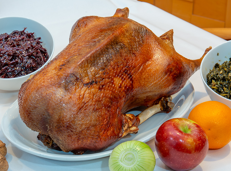 Natürlich können auch ab 11.11.2025 ganze gebratene Enten (für 2-3 Personen für 55,00 Euro) und Gänse (für 6 Personen für 175,00 Euro) komplett mit Beilagen bestellt werden. Bitte rufen Sie rechtzeitig an, damit Ihre Bestellung eingeplant werden kann. Sie können die Enten oder Gänse dann tafelfertig zum Wunschtermin bei uns abholen. Bitte stimmen Sie die Details mit Ihrer Bestellung ab!